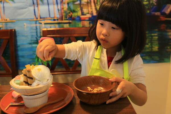 小朋友最期待的就是佈置冰品了,拿起椰子殼自己挖上一球冰淇淋,接著擺上店家提供的軟糖、捲心酥、棉花糖等配料,再淋上巧克力、草莓或是芒果醬,美味的冰淇淋完成!自己做的冰淇淋最好吃了。