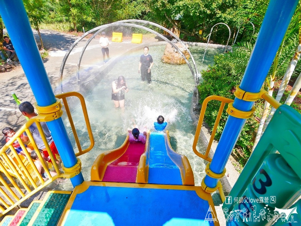大大的戲水池,引用清涼的山泉水,水深不高,可以放心讓小朋友玩,戲水池旁設有SPA花灑,爸媽還能按摩一下,遊戲區設有大沙坑、3座搖搖馬與一個蹺蹺板。
