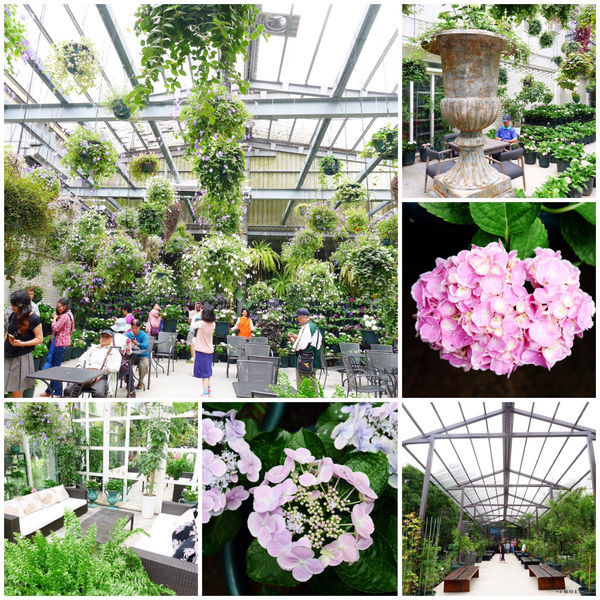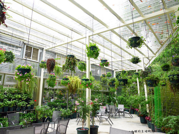 走入溫室內,四周皆被綠意包圍,粉、白、紫、桃紅、嫩黃等花朵點綴其中,偶見蝴蝶穿梭花群,花園內擺放休閒桌椅讓遊客坐著欣賞,感受悠閒的氣氛。
