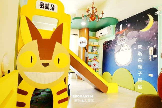 兒童遊戲區位在三樓,一上樓就會看到超吸睛的龍貓造型溜滑梯,滑梯下方還有玩具與超多的小車車,一旁的櫃子上擺滿玩具、桌遊、繪本圖書等。民宿主人也有提供溫奶器、奶瓶消毒鍋、小烤箱、奶瓶刷等物品,還有不少小餅乾、小零食讓房客取用。