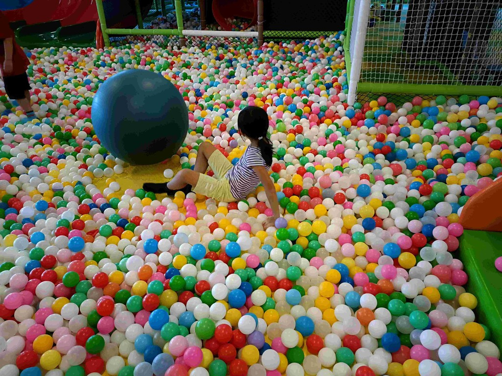 這裡有小朋友最愛的繽紛大球池,球池上有泡泡球、氣墊滑梯與一些充氣玩具。