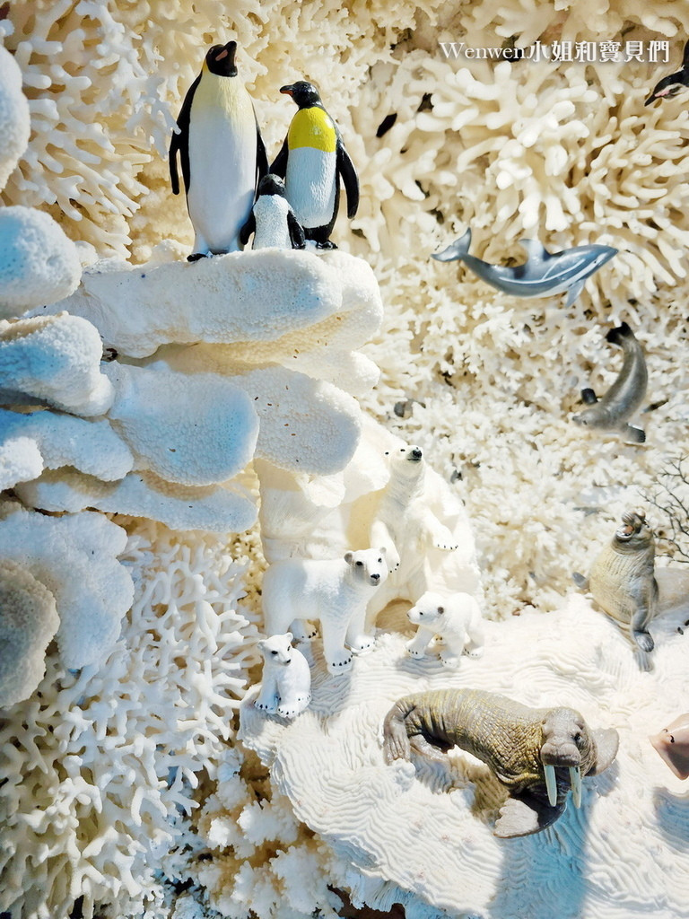 整個牆面以白色珊瑚為基底,再加上藍色、紅色、紫色珊瑚做點綴,非常夢幻迷人。