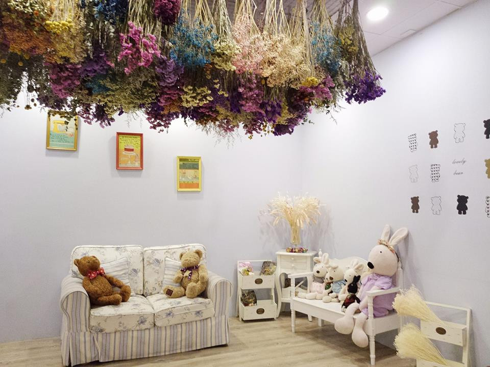 這裡的兒童遊戲區較不一樣,一貫的鄉村風格,花朵布沙發、可愛的布偶排排坐,有廚房組、繪本圖書與一些玩具,天花板垂掛著漂亮多彩的乾燥花,小朋友忙玩耍,大人忙拍照。