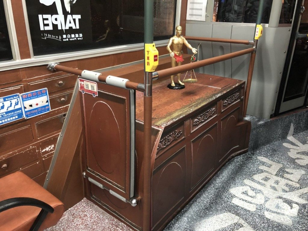 主題公車車廂外是醒目的紅色,繪上台北古蹟,車廂內則依不同主題做佈置,像是以永樂市場布行為主題,地板舖上紅磚步道並利用彩色花布進行裝飾,前方平台展示早期的蒸汽熨斗。以中藥行為主題的公車則舖上磨石子地板,車廂化身為放置中藥的木櫃,前方平台有著精典的18銅人像與古秤,整個公車的設計擬真度很高,非常特別。