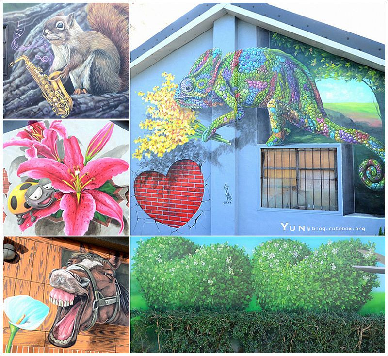 鮮艷的色彩、立體畫作,互動式拍照設計,讓遊客也能變成作品裡的角色,作品有巨大的彩色海芋、向日葵與蝴蝶結、石虎、大鴕鳥、七彩變色龍、愛心矮樹叢與吹薩克斯風的小松鼠等,多種風格一次收集。