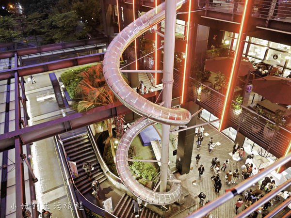 Weeeeee! Slide在A8館3樓,一路滑溜至B1只要15秒!金屬旋轉滑梯上方是透明設計,到了晚上LED燈亮起時非常炫麗,白天夜晚各有特色美。