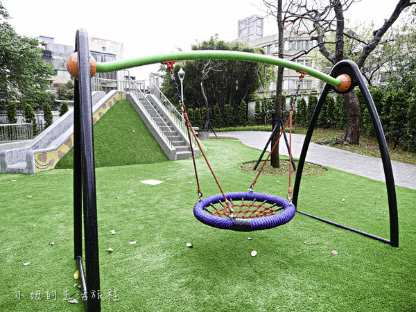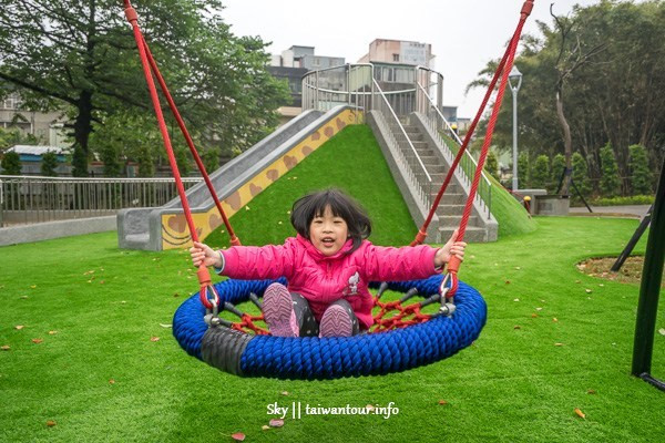 新北市林口也有特色公園嘍,地點就在林口區公所旁的興林口公園,2018/01/27正式啟用,有美美的人工草皮鋪面,小山丘溜滑梯、鳥巢鞦韆與沙坑,雖然遊戲場不算大,不過全新的設施還是可以讓小朋友開心玩。