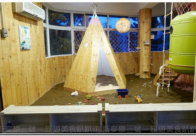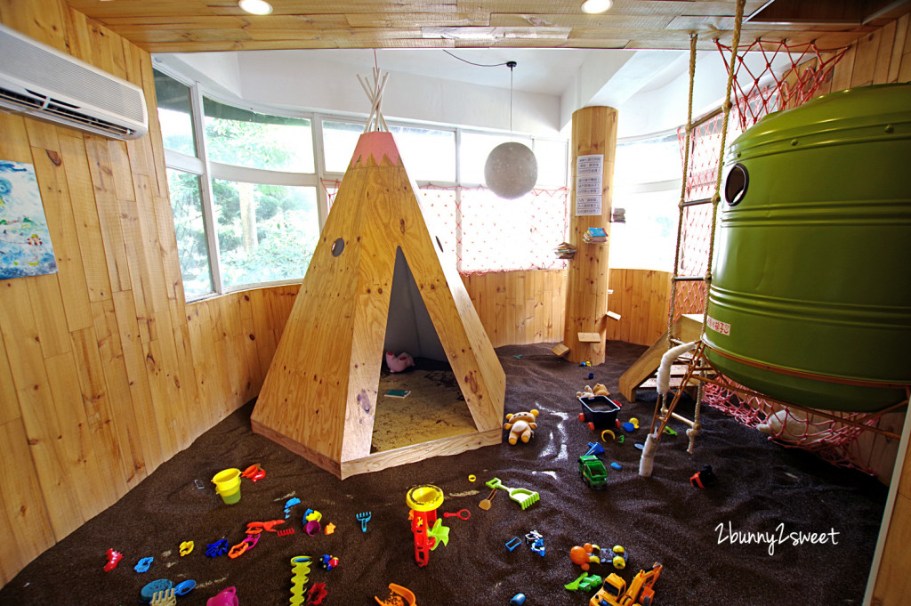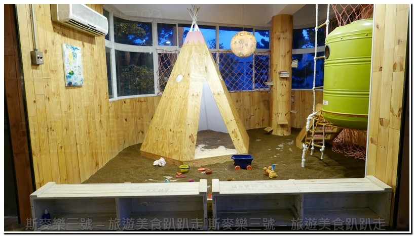 兒童遊戲區在餐廳最內側,遊戲區鋪滿決明子沙,提供多樣挖沙玩具,還有木製印地安小帳篷、迷你登月艇等設施,跟餐廳的風格一樣整個遊戲區也很有個性。