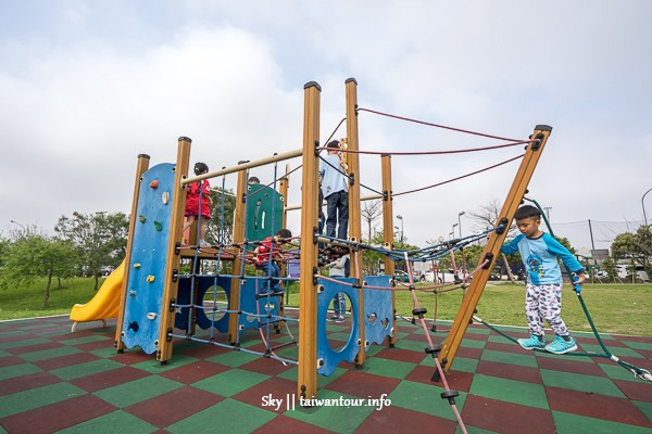 位在桃園鄰近華泰名品城的青埔公四公園,2018年初也加入特色遊戲場行列,公園內有三座繩網攀爬遊具,玩完還能去華泰名品城逛逛用餐。