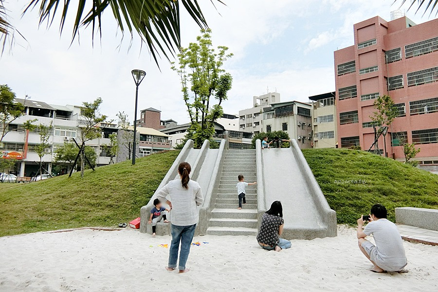 磨石子溜滑梯共有3座滑道,2窄1寬,寬滑道適合親子共玩,小朋友可以爬中間的階梯上去,也可以由一旁的小山丘上去,來回幾趟夠耗體力。
