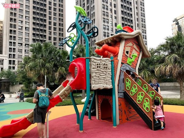 新完成的遊戲場地板鋪面色彩繽紛活潑,中間有一座像傾斜樹屋的溜滑梯遊具,外觀模樣非常逗趣,好像走入童話森林裡會看到的樹屋,樹屋有階梯與假岩石二種攀爬方式,另一側是粉色溜滑梯,最下方還有個樹洞可以當小朋友的秘密基地。