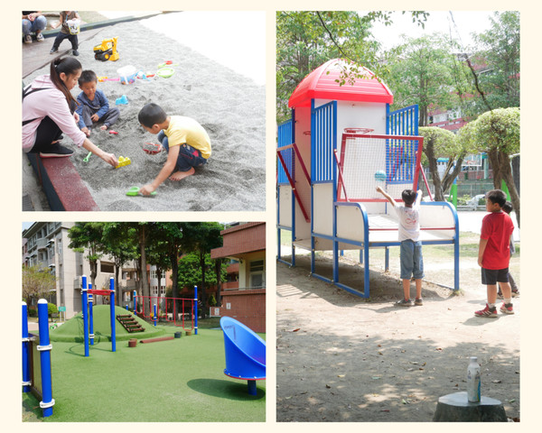 全新的遊戲場分為二大區,一個是小山丘攀爬遊戲區,小小的山丘有攀岩設施、平衡木,另一側平滑面可當滑梯溜下去,山丘延伸出去的有二組攀爬設施,其他還有傳聲筒、跳樁與二座旋轉搖椅。