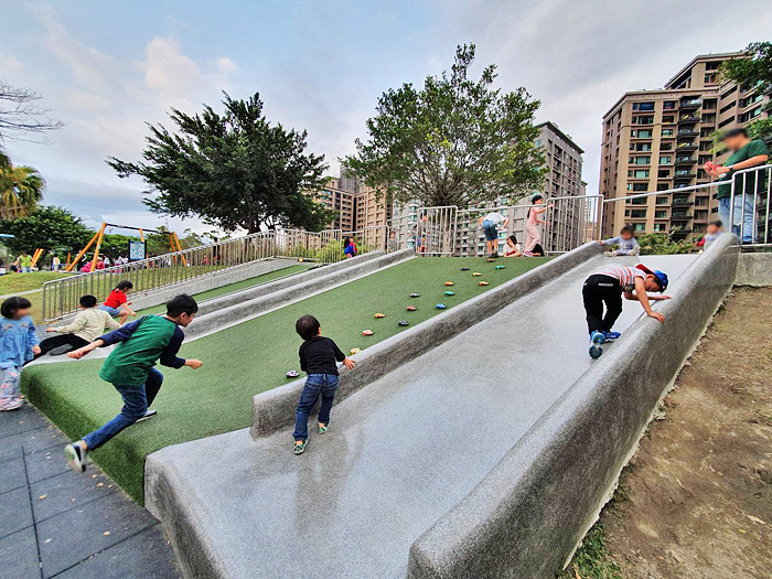 再往另一側走可以看到山丘草皮磨石子滑梯,滑梯有寬、窄二道,草皮設有攀岩與繩索攀爬,因為坡度不陡,小小孩也能輕鬆挑戰攀爬。