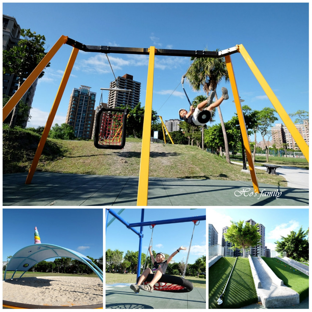 沙坑旁有一座鳥巢鞦韆,另一側有二座一般鞦韆,再往另一側走可以看到山丘草皮磨石子滑梯,滑梯有寬、窄二道,草皮設有攀岩與繩索攀爬,因為坡度不陡,小小孩也能輕鬆挑戰攀爬。