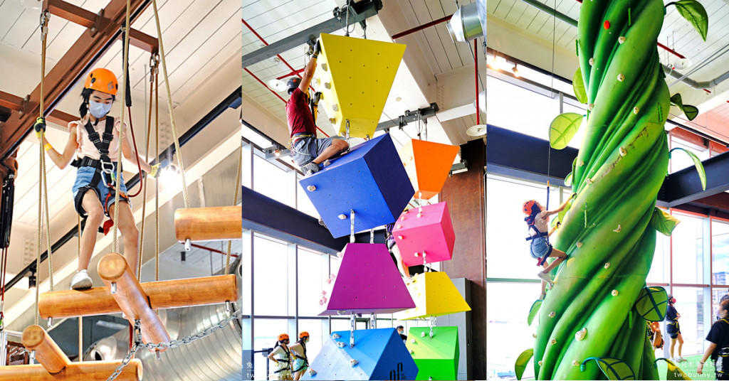 這裡設計有16組不同元素造型的攀岩牆,有趣味造型的巨人豆莖、也有以輪胎組合成的輪胎攀爬,小朋友只要有勇氣,應該都能完成爬到最上面的任務。