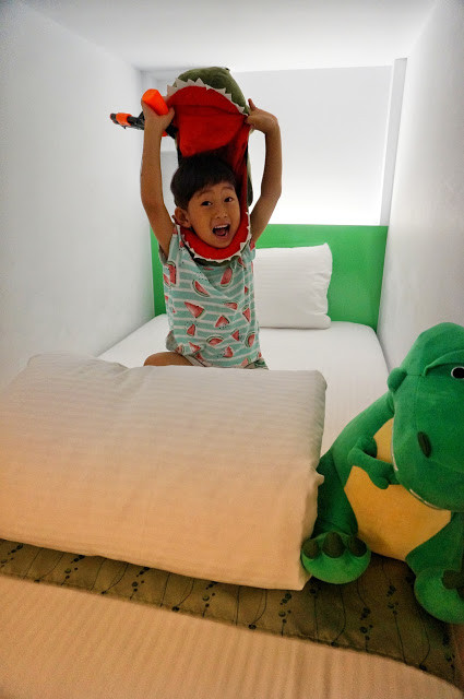 3間親子溜滑梯房型分別是恐龍四人、城堡五人與海洋六人房,溜滑梯的設計皆有主題特色,房內也都有提供繪本圖書與不同的玩具,小朋友一進房就可以忙著玩。