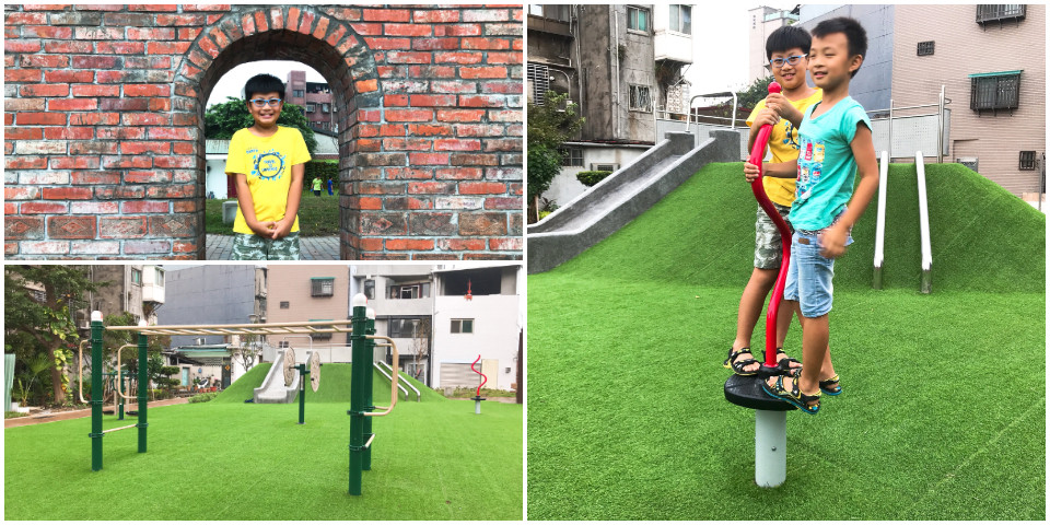 兒童遊戲場以人工草皮鋪面,有一座小山丘,山丘上有磨石子滑梯與雙杆式滑梯,前方有一個立式旋轉座與單槓遊具,在遊戲場內也有幾座成人體健設施,方便大人健身時可隨時看著小朋友的遊玩動態。