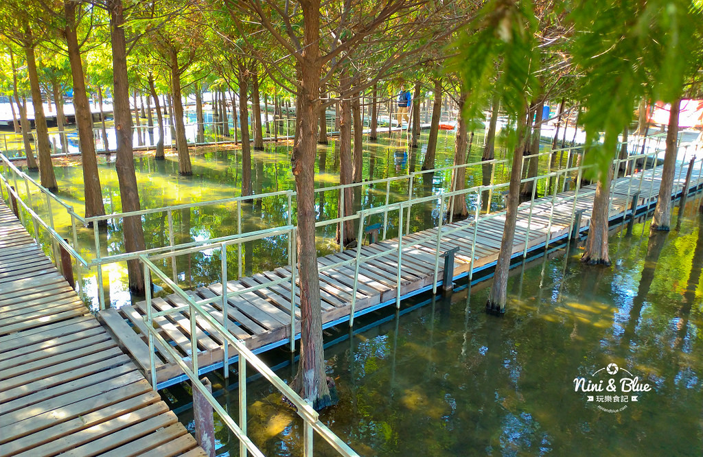 中科落羽松就在廣興宮對面,落羽松分為水、陸二區,水池區中間設有木棧道方便大家走入拍照,木棧道二側設有圍欄,可以放心帶小朋友走進去,池子裡養了不少魚,現場也有販售魚飼料,爸媽拍照時,小朋友則忙著餵魚,一點也不無聊。
