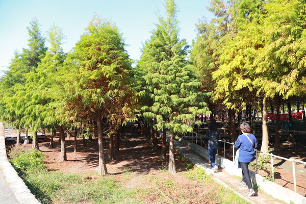 陸地落羽松就在水池後方,雖然少了水中倒影的景色,但也有更顯秋冬風情,裡面還有擺放幾張座椅讓遊客坐著拍照。