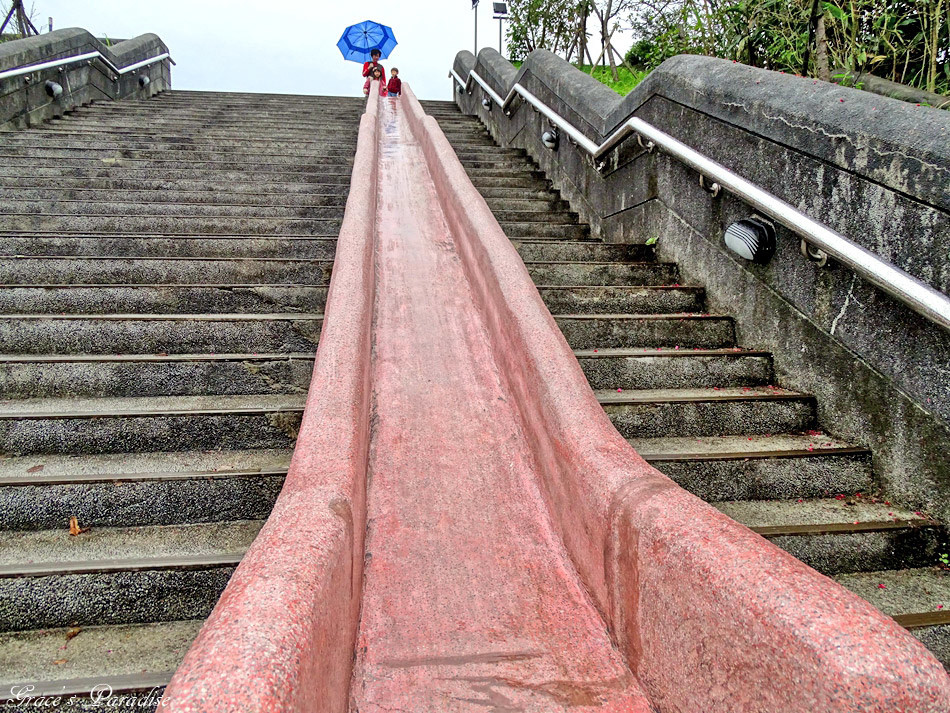 遊戲場還有較特別的涵管眺望台,共有上、下2座,下方那座可以走進去,再由滑杆下來,很受小朋友喜愛。其它還有沙坑、Monkey Bar、2座鳥巢鞦韆、跑跳小山丘、成人體健設施等。一旁設有公廁與沖洗區,對爸媽來說太方便了。另外原本在階梯的磨石子溜滑梯保留,還是可以帶小朋友去玩。