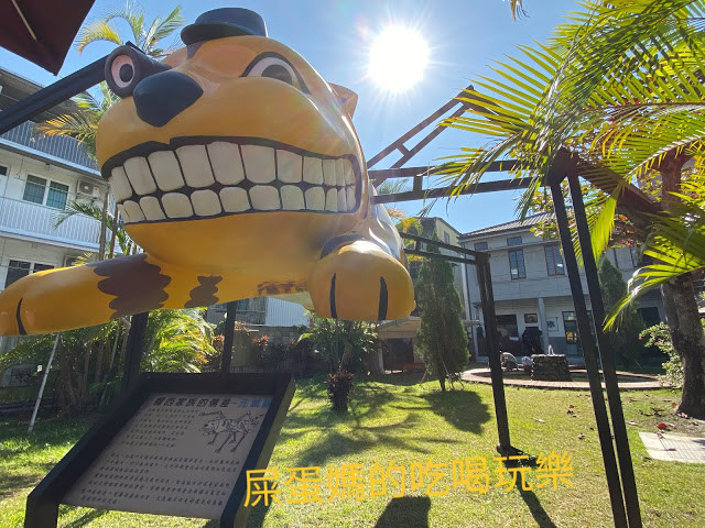 室內玩不夠還可以帶小朋友到戶外草皮庭院跑跑,那裡有個黃色大貓造景,還有一座泡腳池可以讓小朋友玩水。