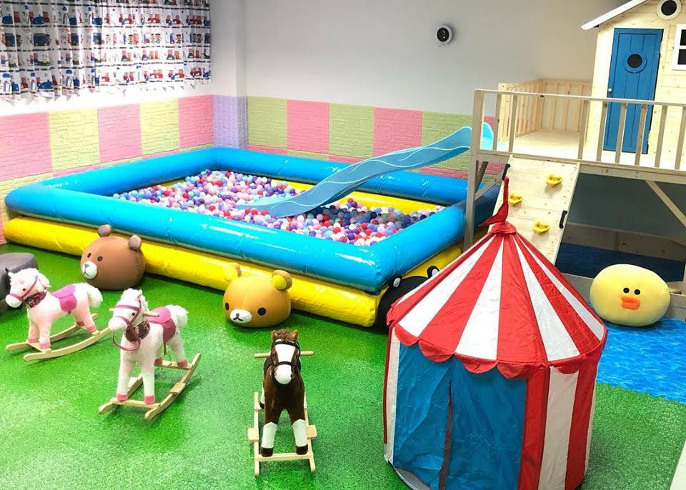 餐廳分為一樓與B1二層,一樓為主要用餐區,B1為遊戲空間,有擺放家長休息桌椅,用完餐點即可帶小朋友下去遊玩,有小木屋溜滑梯球池、搖搖馬、小帳篷、廚房組、積木桌與繪本圖書等玩具,也可租借桌遊來玩。
