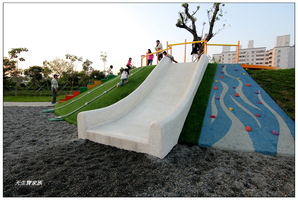 遊戲場內大一座結合攀爬設施與磨石子溜滑梯的小山丘,小朋友可以透過攀岩、繩索攀爬或彩色階梯上去玩滑梯,下方採礫石鋪面減緩衝力。小山丘前方有二座鳥巢鞦韆、一座大型繩網攀爬、坐式旋轉盤與站式旋轉盤。