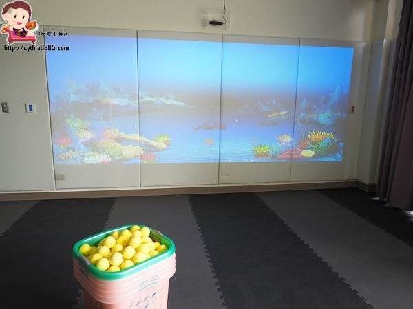 運動中心共有4層樓,兒童遊戲室在2樓,裡面是多媒體互動遊戲,以海洋世界為主題,小朋友可以拿球丟螢幕與遊戲互動,還能訓練手眼協調。