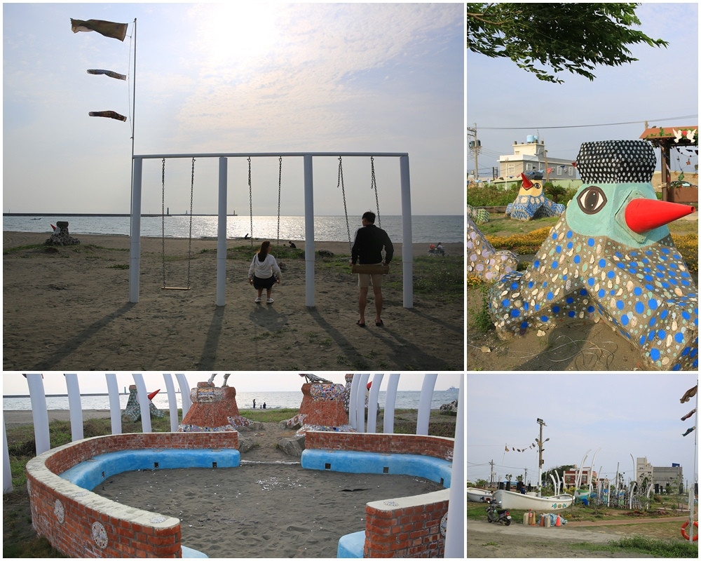 當地居民利用巧思,將原本灰樸樸不起眼的消波塊畫成繽紛海鳥造型,並利用貝殼做裝飾,沙灘邊一隻隻大海鳥可愛又吸睛,而一旁廢棄的漁船也漆成白色並加上魚的圖案,小朋友可以坐上去拍拍照。