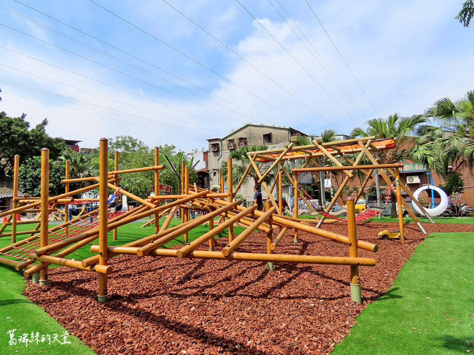 全新的特色遊戲場有別於其他公園,裡面以少見的木造攀爬設施為主,由原木交錯出不同的闖關關卡,小朋友在這裡變成小猴子盡情探索攀爬,還有繩網攀爬與可以躺著搖擺的吊床。