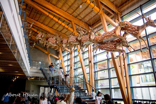 由入口處進來是第一館「自然史教育館」,一進來就讓人眼睛一亮,大片落地窗與在上空奔跑梅花鹿,仿佛時光與歷史的洪流,在這裡出土的化石,不論是動物或人類,都述說著在地的故事。