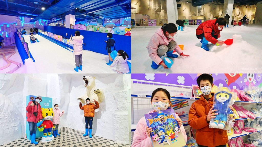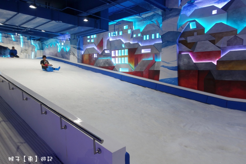 現場提供免費雪靴,需穿上襪子才能穿雪靴。小朋友看到雪地好興奮,尤其炎炎夏日可以摸冰涼涼的雪超開心,且每半小時會降下雪花更有冬天的感覺。裡面有大小二座滑雪道,現場也有工作人員負責秩序,避免發生碰撞。另外爸媽記得帶上挖沙玩具來給小朋友玩雪,現場也有販售挖雪工具。