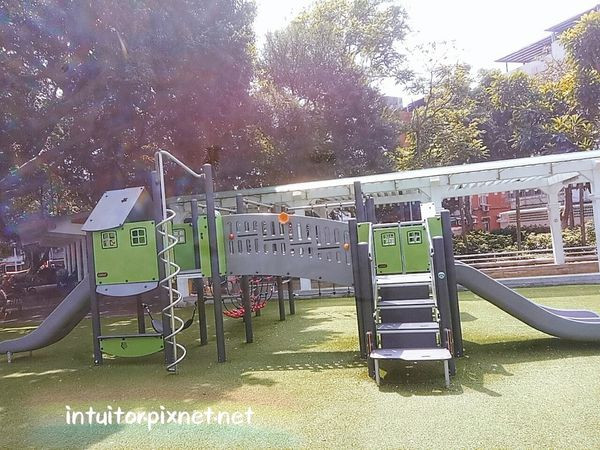 公園兒童遊戲場依小朋友年齡分為2區,一個是適合幼兒的溜滑梯遊戲組與搖搖馬,溜滑梯遊具上有繩網攀爬、小型搖椅、螺旋滑桿等,適合學齡前小朋友遊玩。
