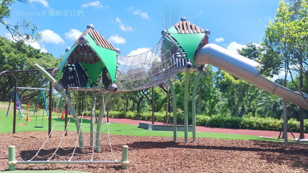 松鼠攀爬遊戲區採木屑鋪面,減少衝擊。繩網攀爬設計不同於一般的階梯,遊玩多了挑戰性。(夏天太陽大時,金屬溜滑梯表面較燙,爸媽記得先確認溫度再讓小朋友玩)
