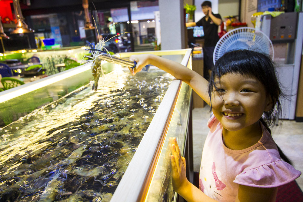 店家用餐方式為自助燒烤吃到飽,水道蝦集中在走道一側,透明玻璃設計讓大家清楚看到蝦子,小朋友都會好奇的盯著看,且能自己抓蝦更有趣,都搶著要幫爸媽夾蝦呢。