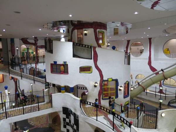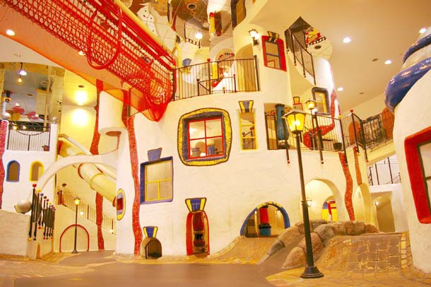 在Kids Plaza內最吸睛的就屬二層樓空間的「こどもの街」,整座城堡由曲線構成,彎曲的牆壁、奇特造型的窗戶、像迷宮般的廊道,好像走入魔幻世界裡。