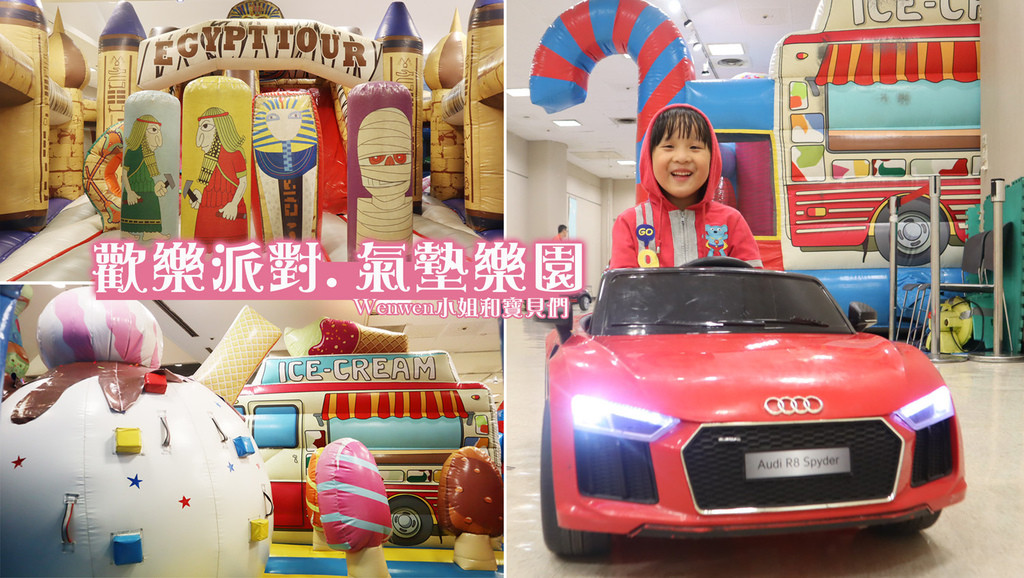 館內共有冰淇淋樂園、埃及法老王、糖果城堡與衝浪球池等4主題氣墊設施,溜滑梯、跳跳床讓小朋友盡情放電,可愛的造型也很受小朋友喜愛,另外還有超跑可以玩,現場完成新光三越FB貼文按讚+分享,可以兌換乘車券一張,免費玩超跑。