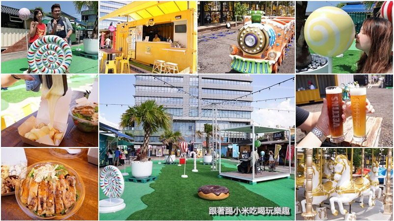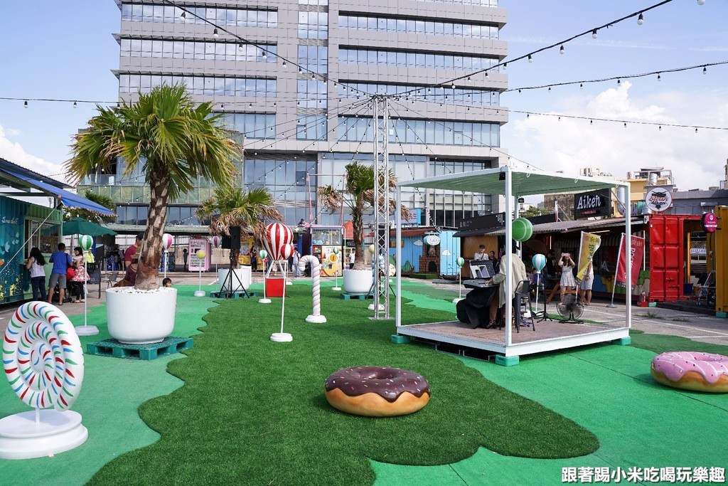 由貨櫃屋組成的市集,有不少餐飲店家,入口處還有小貨櫃的拍照區,每個貨櫃裡都有不同主題風格讓大家入內拍照,戶外人工草皮區則有甜甜圈、棒棒糖等裝置藝術,小朋友趴在甜甜圈上拍照也很可愛呢。