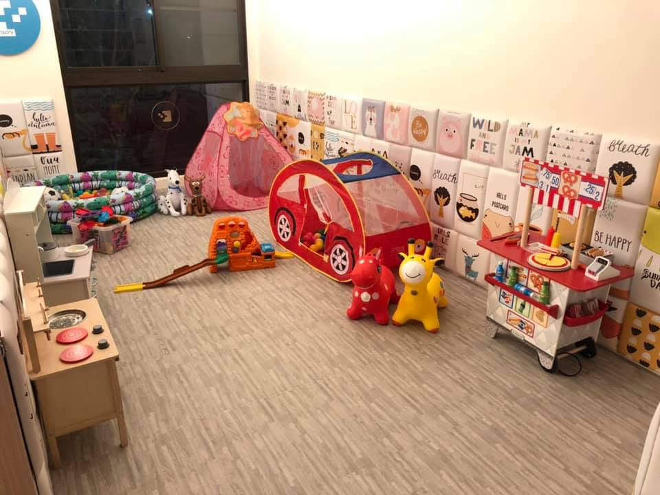 餐廳共有2層樓,有沙發座位與一般座位,兒童遊戲區位在2樓,有廚房組、跳跳馬、小帳篷、迷你球池、車車軌道組等玩具。遊戲區周邊利用卡通圖樣軟墊包覆,童趣可愛,又能保護小朋友的安全。