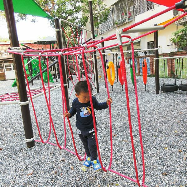 國小區也有塑製溜滑梯遊戲組、垂直攀爬網、跳樁、冒險踏樁、磨石子溜滑梯等,而在操場周邊還有獨木橋、天梯、鐵製鑽籠、立體攀爬架,適合大一點小朋友玩。
