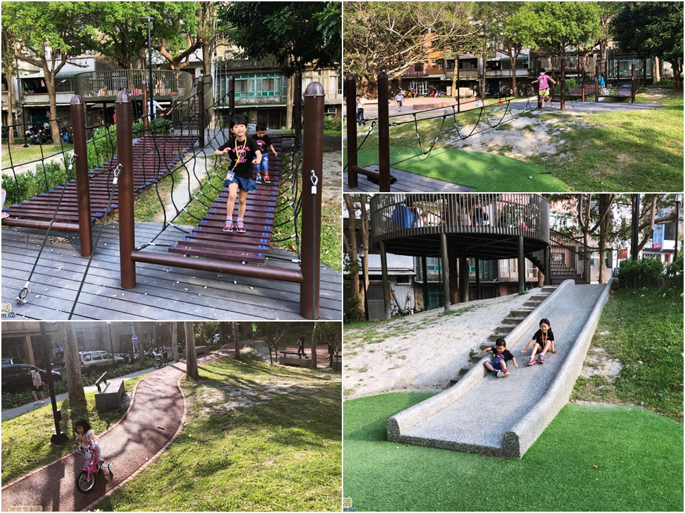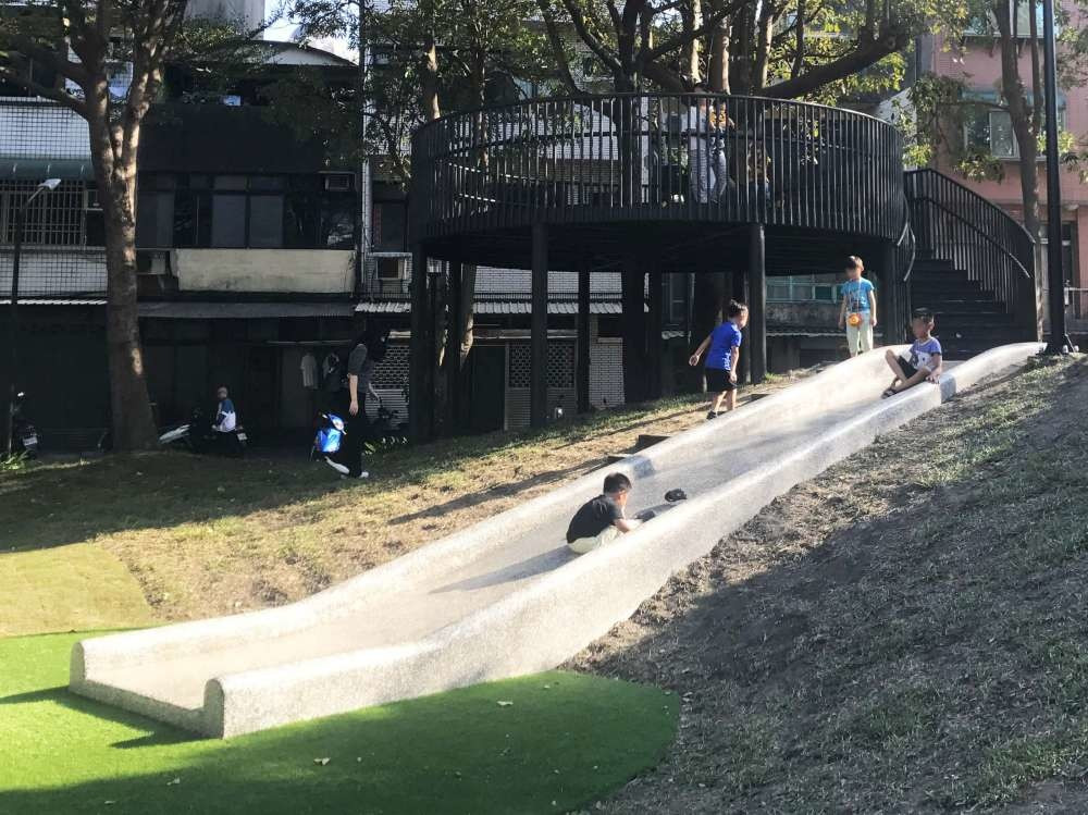 遊戲場以榕樹公廣場為發想,保留園內超過百年的大榕樹,並在一旁設置地景磨石子溜滑梯、樹屋景觀休憩平台。