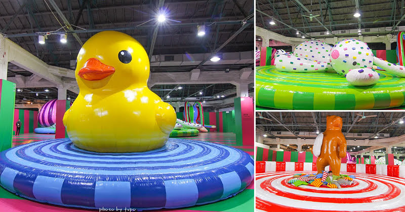 來自霍夫曼的大型動物裝置藝術-黃色小鴨、月兔、河馬等作品,現在化身為可愛又好玩的氣墊遊戲!展出地點就在高雄駁二特區,大小朋友可以近距離欣賞藝術作品,更可以蹦跳玩樂。