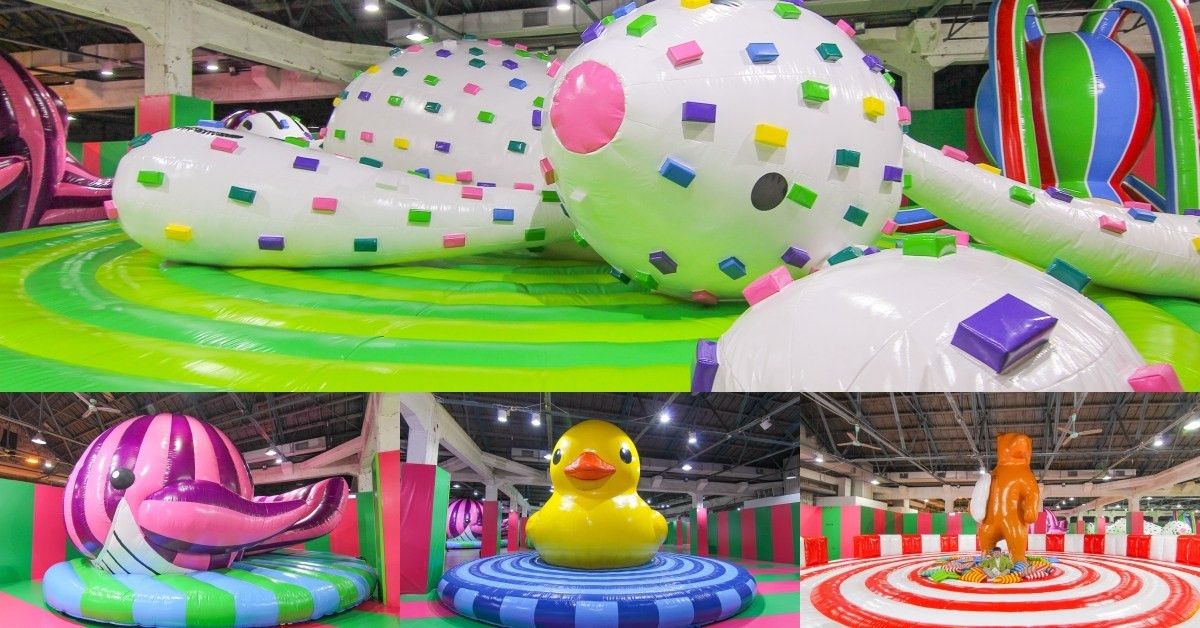 館內共推出黃色小鴨、月兔、爬牆虎大熊、克拉肯章魚、寵物貓、粉紅鯨、抱抱象、鐵人、神戶蛙、胖猴子、泰晤士河馬等11座造型氣墊,其中粉紅鯨是今年全新創作。