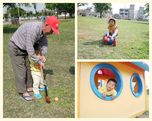 兒童遊戲場是一座塑製溜滑梯遊具,上方有遮陽簾可以幫小朋友擋去熱辣的陽光。公園內草皮空間非常寬廣,很適合小朋友跑跳,這裡也有人在玩木球與槌球,所以草地上有設置球門,可以帶上小球來讓小朋友玩。