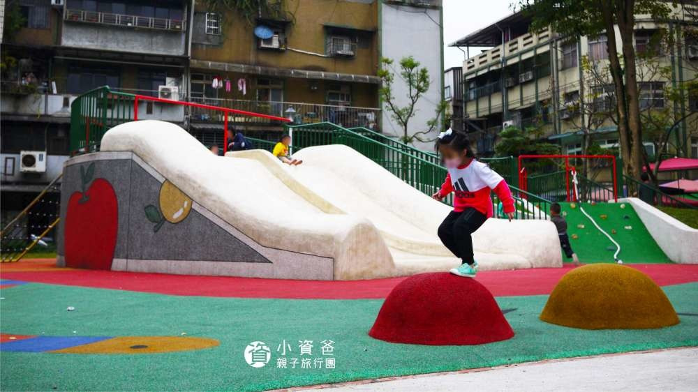 公園不算大,但設計的很可愛,以水果為主題的遊戲場,利用軟墊與凸出的迷你山丘打造繽紛的水果與毛毛蟲造型,氣氛很歡樂。