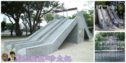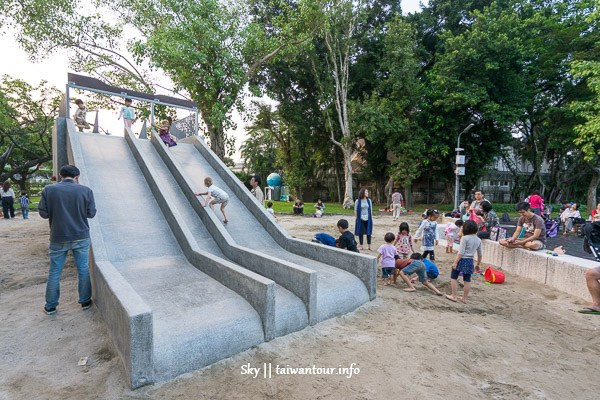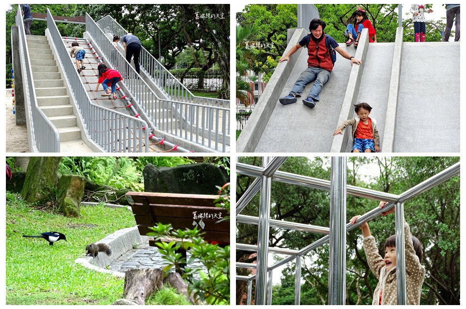 公園裡大片的綠地、小魚池,隨處可見松鼠出没,小朋友們忙著尋找牠的蹤影。裡面還有不少兒童遊樂區,其中一座早期的磨石子溜滑梯在2017年重新整修開放,滑梯改成二道更寬敞,後方樓梯處加設繩索攀爬設施,旁側變小型攀岩牆,最棒的是滑梯下方為120坪的無框架沙坑,記得帶挖沙玩具來,小朋友可以玩的更開心。
