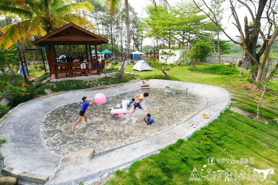 營地整理的很漂亮,厚實的草皮、涼庭、小橋、花卉植栽,整體感覺很舒服。兒童遊樂設施有戲水池、泰山溜索、盪鞦韆、彈跳床、幼兒滑梯、射箭、撈魚池等,大人也有釣魚池可以享受釣魚的樂趣。