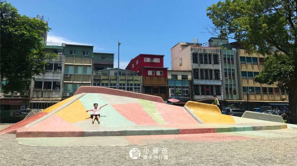 溜滑梯另一側有攀岩牆、立體攀爬架與編織繩網,四周有旋轉椅、搖搖椅、蹺蹺板與體健設施,礫石舖面則是小朋友愛的玩沙區。只可惜遊戲場無遮陽設施,夏季前來可以先去周邊室內景點走走,待太陽小一點再帶小朋友來放電。
