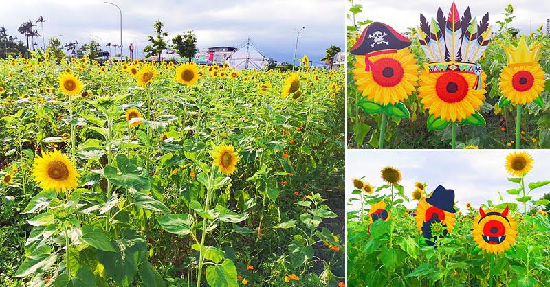 大片金黃花朵抬頭望著太陽,精神奕奕的模樣,也讓人心情都開朗了起來。且在花海內還穿插著幾個向日葵立牌,戴著眼鏡、帽子、皇冠、海賊帽等,逗趣的模樣讓人會心一笑。