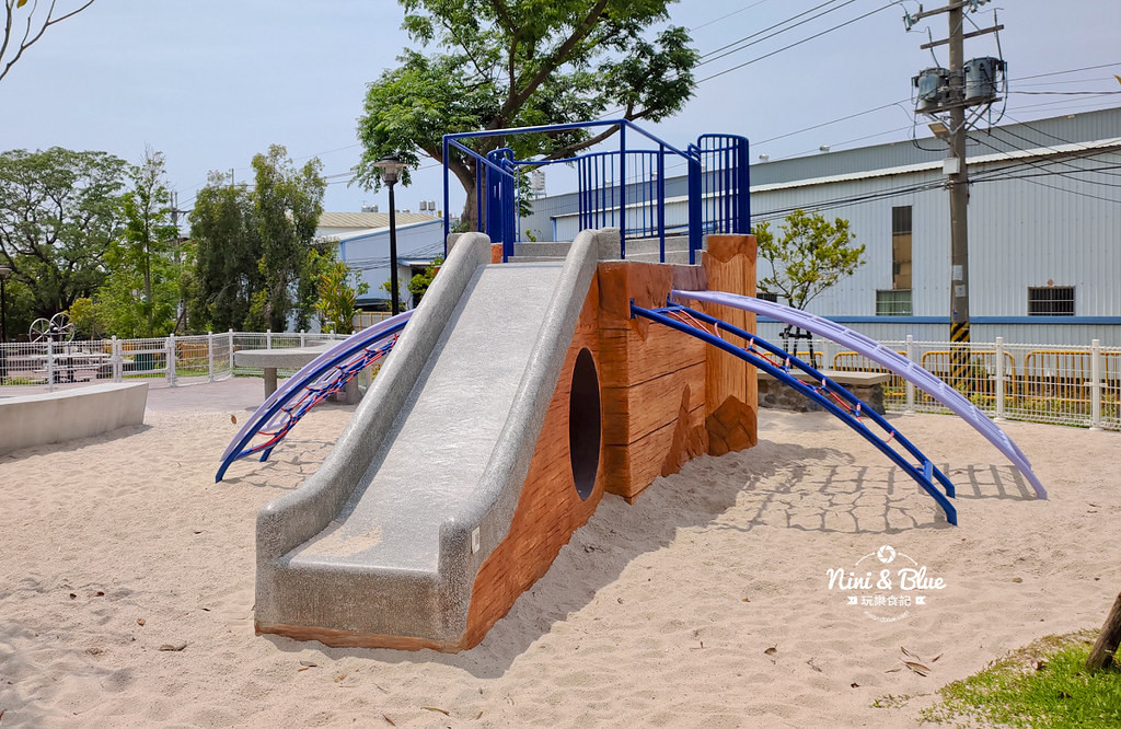 溜滑梯的另一側有一座鳥巢鞦韆,鞦韆下方則是以礫石鋪面,整個遊戲場使用柵欄圍住,可保持沙坑內的整潔,讓家長安心。公園內的水道可見蝌蚪、小魚等,可以帶小朋友來看看。